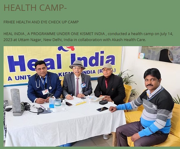 FRHEE HEALTH AND EYE CHECK UP CAMP FRHEE HEALTH AND EYE CHECK UP CAMP HEAL INDIA , A PROGRAMME UNDER ONE KISMET INDIA , conducted a health camp on July 14, 2023 at Uttam Nagar, New Delhi, India in collaboration with Akash Health Care.